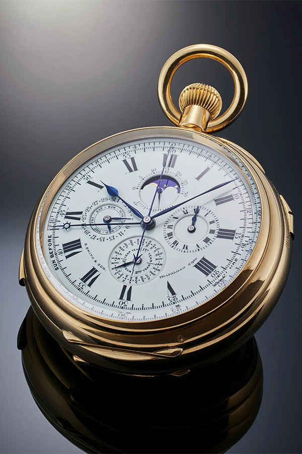 Commissioned in 1914 by Smith & Sons of London for a South American elite, the double-dialed masterpiece contains 19 complications—a tour-de-force of technical ingenuity that includes: