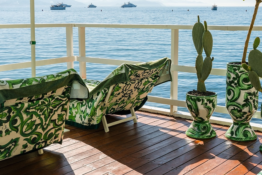 Nestled in Paraggi Bay’s exclusive enclave, Dolce&Gabbana has reinvented Le Carillon Beach Club to embody the charm of Ligurian tradition. The Verde Maiolica theme—an ode to the region’s iconic green ceramics—graces every detail, from boutique spaces to bar counters.