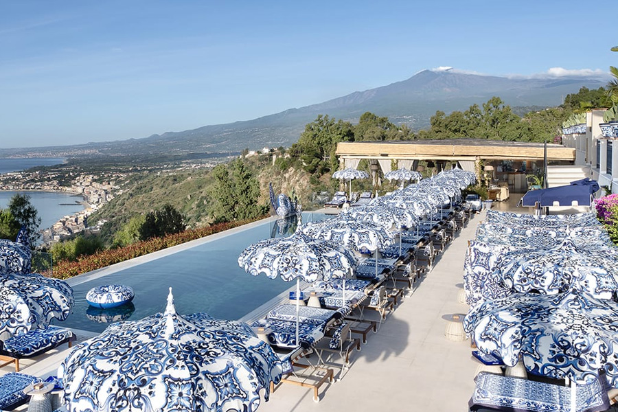 Dolce&Gabbana’s Sicilian roots take center stage in Taormina, the crown jewel of DG Resort 2025. At the stunning San Domenico Palace, a Four Seasons property perched high above the Ionian Sea, the Blu Mediterraneo theme casts a serene glamour over the poolside terrace and an exclusive boutique housed in a centuries-old monastery.