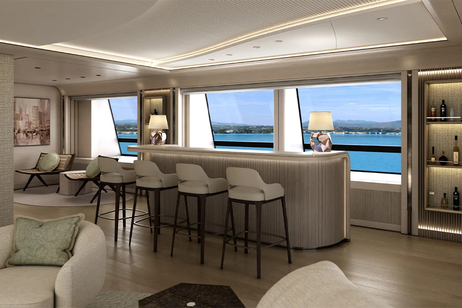 Golden Yachts enlisted the combined expertise of Massari Design and Studio Vafiadis to craft a vessel where art meets engineering. Their collaboration has given life to a yacht where every curve, surface, and space speaks of unparalleled craftsmanship. From the polished gleam of sculptural furnishings to interiors imbued with the grace of artistry, every element of O’Madeleine has been curated to elevate the very essence of bespoke luxury.