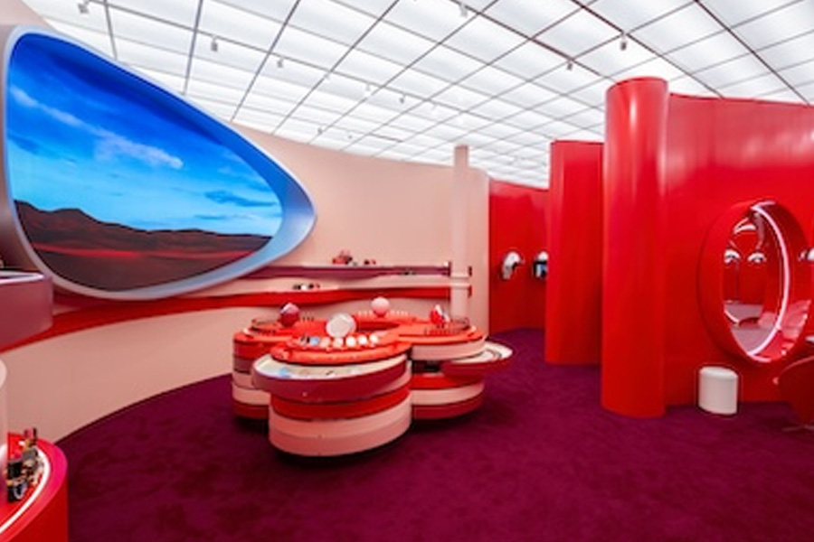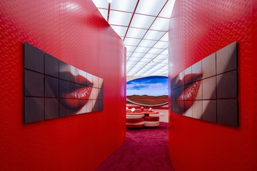 The Soho boutique is conceived as more than a retail space. Drenched in rich red tones and futuristic curves, the design envelops visitors in the sensorial universe of La Beauté. A 28-screen digital entryway serves as the gateway to the experience, while sculptural portals reveal the craft and inspiration behind the collection. At its center, a floral installation shaped like Louis Vuitton’s signature monogram introduces the full line of 55 LV Rouge lipsticks, 10 LV Baume lip balms, and eight LV Ombres eyeshadow palettes.