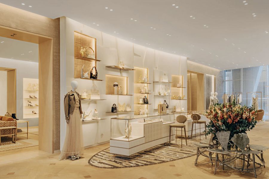 Inside, the flagship unfolds as a sequence of curated experiences rather than a traditional retail journey. From the outset, visitors are immersed in Dior’s universe through refined materials, floral references and museum quality artworks. The space functions as both boutique and gallery, blending fashion, design and contemporary art in a manner that mirrors the lifestyle aspirations of the 1%.