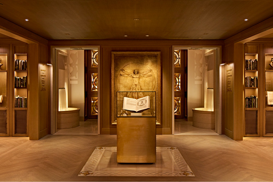 Dining at RH Paris is designed as a sensory journey. Le Jardin RH, located on the second floor, offers Mediterranean and American classics beneath a spectacular glass-and-steel canopy inspired by the Grand Palais. Above it, The World of RH Bar & Lounge serves rare wines and craft cocktails, while Le Petit RH presents gourmet cuisine in a setting that includes handblown glass installations and champagne lacquered walls.