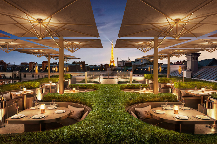 The rooftop garden offers breathtaking panoramic views of landmarks like the Eiffel Tower and the Grand Palais, creating an unrivaled setting for private events and intimate gatherings.