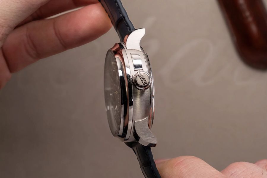 A patented slide mechanism located unconventionally on the right side of the case controls chiming modes: Grande Sonnerie, Petite Sonnerie, or Silence. The minute repeater is activated not by the slide, but through a cleverly engineered pusher integrated into the crown—a first for the brand.
