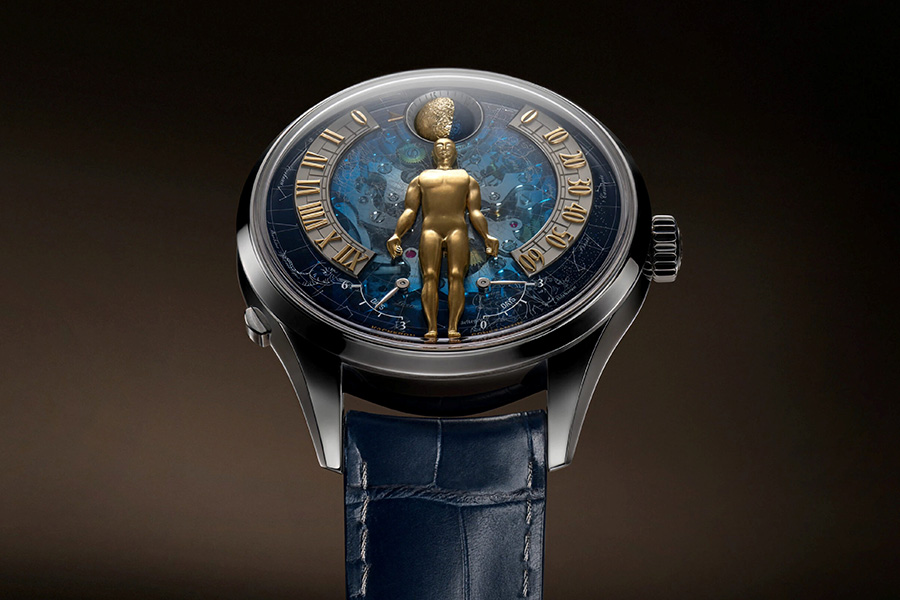 On the front dial, a golden titanium figure—evocative of the 18th-century Astronomer automaton—sweeps across twin arcs, displaying hours and minutes through bi-retrograde indications. Below, a dual power reserve display offers both balance and function. The night sky in the background is a recreation of Geneva’s firmament on 17 September 1755, the date of the Maison’s founding.