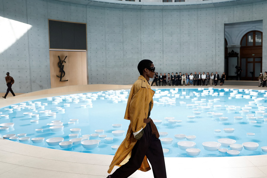 Set against the marble arches of the Parisian Bourse de Commerce, Anthony Vaccarello, Saint Laurent’s artistic director, offered guests far more than a front-row seat. He curated an experience—a departure not only from the swelter of Paris’s summer but from the ordinary rhythms of luxury fashion itself. The runway was an homage to Fire Island’s unstudied glamour, paired with the precision of Parisian tailoring, creating a dichotomy that speaks to those who value both carefree freedom and unwavering sophistication.